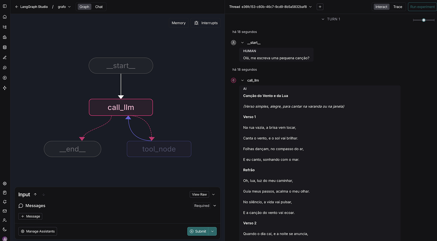 Experimente! Suba o grafo que criamos na aula anterior e veja por si mesmo como é fácil rastrear o fluxo de uma conversa e o acionamento de ferramentas.
